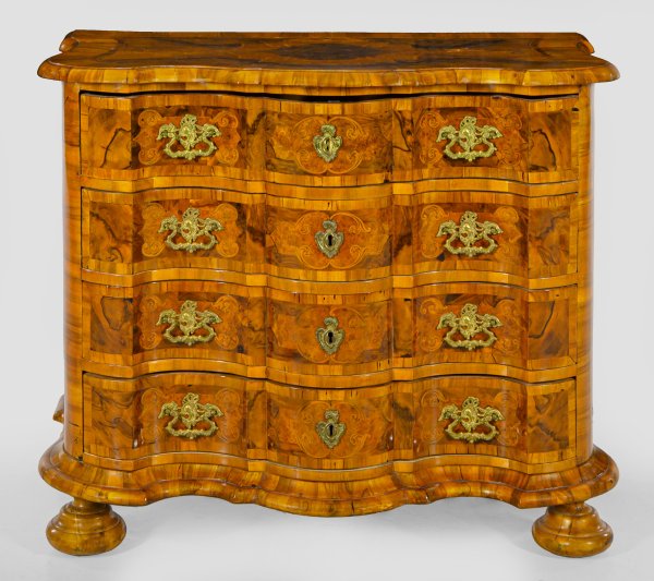 Nussbaum, furniert sowie Einlagen aus Wurzelnuss, Ahorn und Pflaumenholz. Bombierter Korpus mit gerundeten Ecken auf breiter Profilzarge und gedrückten Füßen. In der gegliederten Front vier mehrfach gegenläufig geschweifte Schubladen. Korrespondierende, weit überstehende Deckplatte. Flächendeckend breit gerahmte Furnierfelder, von teilw. verschlungenen Bandeinlagen und intarsiertem Blattvoluten begrenzt. H. 84 cm. 101 cm x 55 cm.