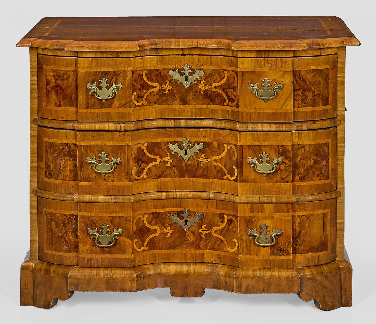 Nussbaum, furniert. Gerader, rechteckig angelegter Korpus mit seitlichen Griffen auf gesägtem Zargensockel. In der gegliederten Front drei geschweifte Schubladen. Korrespondierende, gering überstehende Deckplatte. Flächendeckend breit gerahmte Furnierfelder, von Bandeinlagen begrenzt. H. 78 cm. 95 cm x 54 cm.