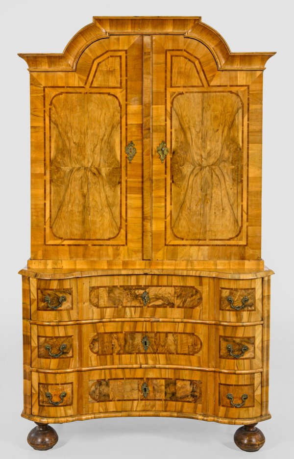 Nussbaum, furniert sowie Einlagen aus Pflaumenholz. Gerader, querrechteckig angelegter Korpus auf schmaler Zarge und hohen Kugelfüßen. In der gegliederten Front drei breite, gegenläufig geschweifte Schubladen. Gering überstehende, profilierte Deckplatte. Zurückgesetzter, zweitüriger Aufsatz mit mittig aufgeworfenem Kehlgesims. Inneneinteilung aus Ablageflächen, kleiner Tür und Schubfächern. Flächendeckend breit gerahmte Furnierfelder. H. 210 cm. 127 cm x 57,5 cm.