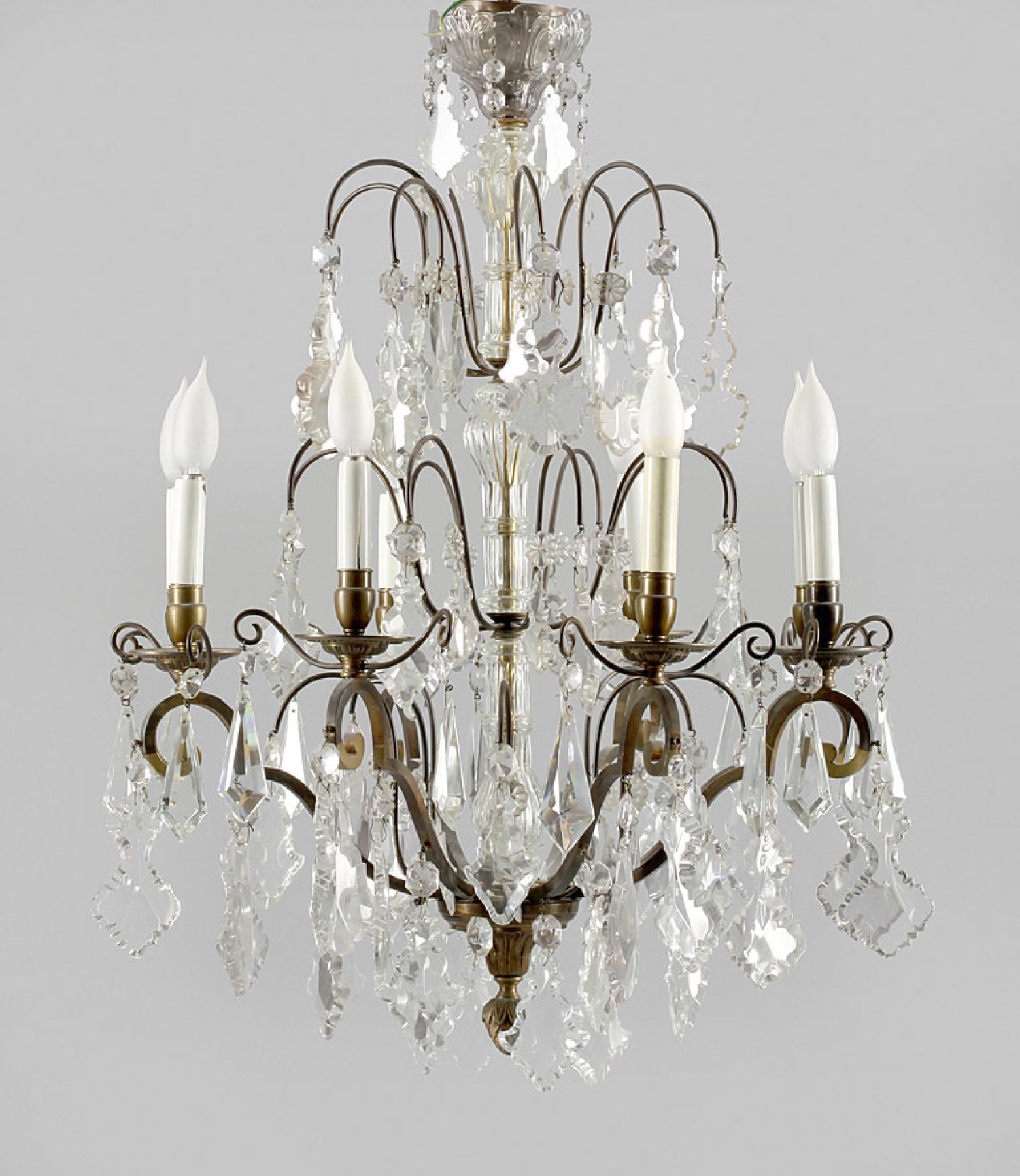 8-flg.; Bronze und farbloses Kristallglas. Balusterförmiger Korpus. Unterhalb davon ausgehend acht emporsteigende, volutenförmig geschwungene Leuchterarme, in vasenförmigen Tüllen über runden Traufschalen. In zwei weiteren Ebenen korrespondierende Stege. Reicher Behang aus unterschiedlichen Prismen. Elektrifiziert. H. 86 cm. D. 58 cm.