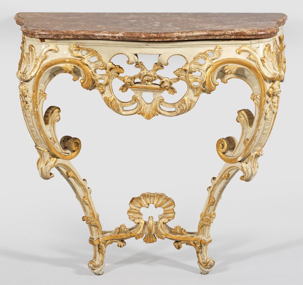 Holz, reliefplastisch geschnitzt, elfenbeinfarben gefasst und teilw. vergoldet. Passig geschweifte, durchbrochen gearbeitete Zarge aus üppigen Rocaillen, in stark geschwungene Beine aus gegeneinandergestellten Voluten übergehend. Unterhalb durch korrespondierenden Steg verbunden. Gering überstehende, profilierte Deckplatte aus rot-beige gemasertem Marmor. Erg.; H. 82,5 cm. 89 cm x 54 cm.