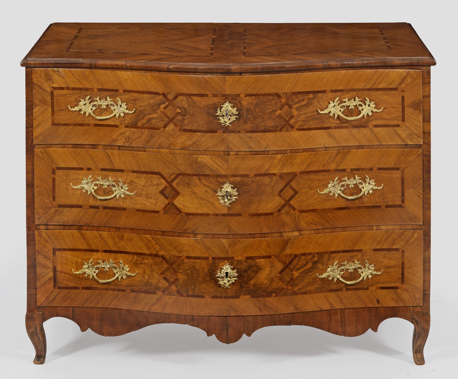 Nussbaum, furniert sowie Einlagen aus Pflaumenholz. Gerader, querrechteckig angelegter Korpus, flankiert von schmalen Ecklisenen, in geschwungene Beine übergehend. In der gegliederten Front drei breite, ausgebogte Schubladen. Gering überstehende Deckplatte. Flächendeckend breit gerahmte Furnierfelder, von Bandeinlagen begrenzt. H. 91 cm. 118 cm x 65 cm.