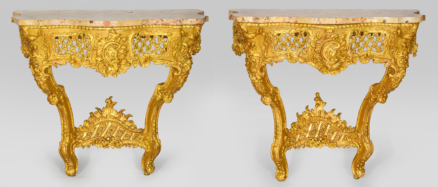 Holz und Papiermasché, gefasst und vergoldet. Passig geschweifte, durchbrochen gearbeitete Zarge aus großen Reserven mit Gitterwerk und Blüten sowie üppigen Rocaillen, in geschwungene Volutenbeine übergehend. Dazwischen breiter, hochgewölbter Rocaille-Steg. Erg. Deckplatte aus sog. Breche d'Alep-Marmor. Rest.; H. 81,5 cm. 91,5 cm x 50 cm.