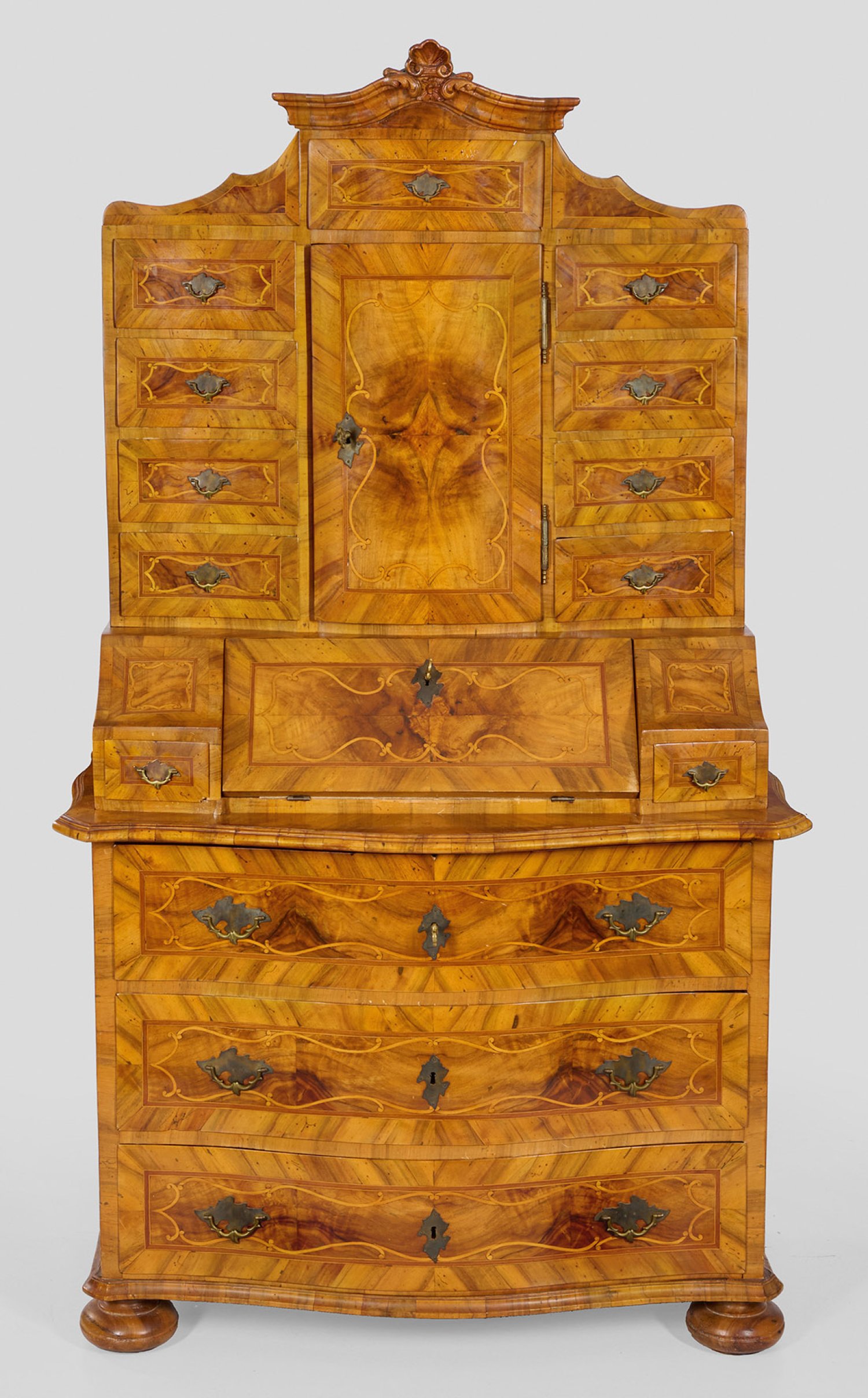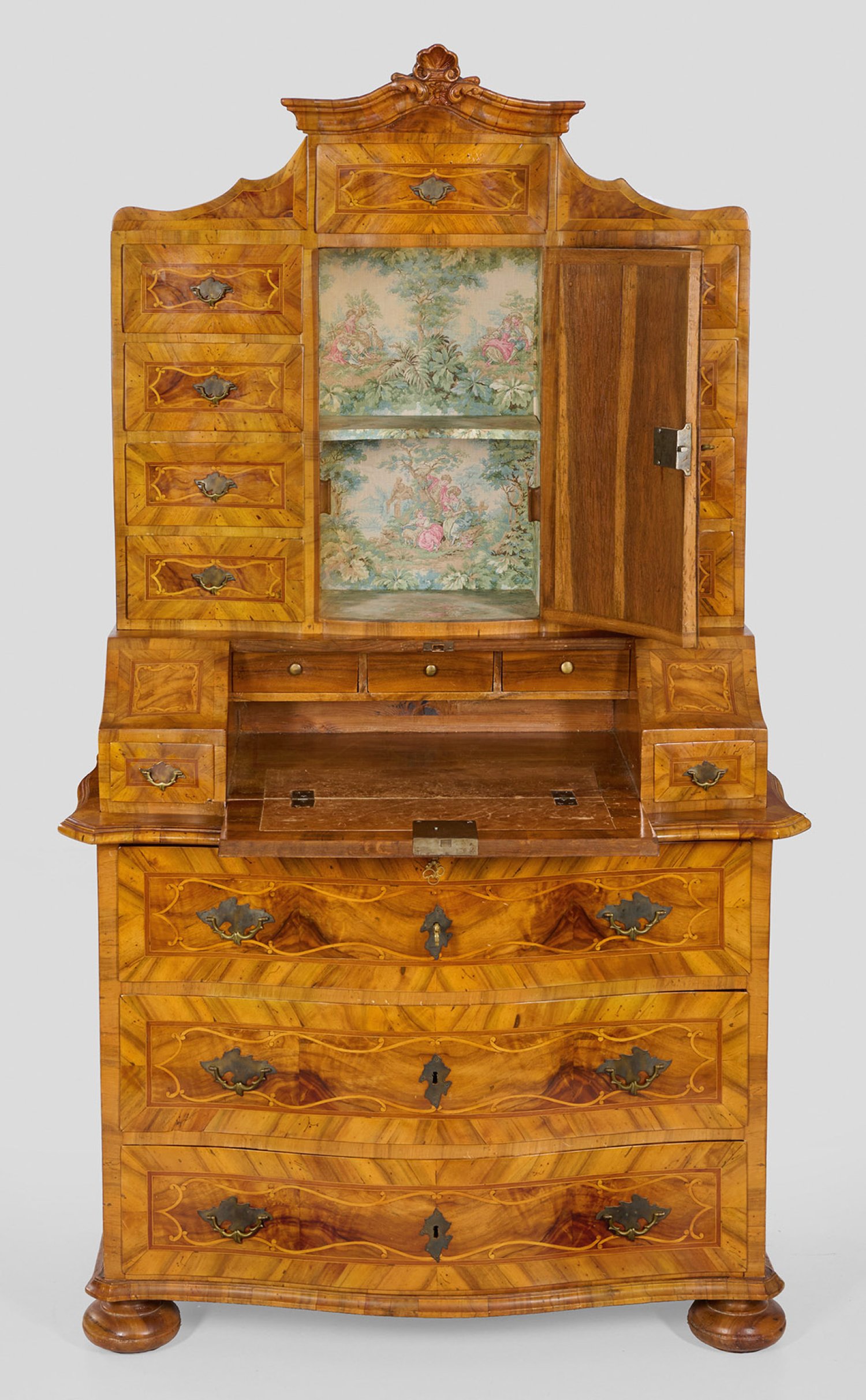 Nussbaum, furniert. Gerader, querrechteckig angelegter Korpus auf schmaler Kehlzarge und gedrückten Füßen. In der gegliederten Front drei geschweifte Schubladen. Gering überstehende, profilierte Deckplatte als Stütze für schräggestellte, abklappbare Arbeitsfläche, flankiert von zwei kleinen Schubfächern. Oberhalb korrespondierender Aufsatz mit bombierter Tabernakeltür, flankiert von Schubfächern mit Zentralverriegelung. Podestförmiger oberer Abschluss mit flach geschweiftem Giebel und Muschelbekrönung. Flächendeckend breit gerahmte Furnierfelder, von Bandeinlagen begrenzt. H. 180 cm. 104 cm x 58 cm.