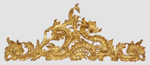 Holz, geschnitzt, gefasst und vergoldet. Geschweift ansteigender, asymmetrisch durchbrochen gearbeiteter Korpus aus plastisch gestalteten, üppigen Rocaillen, Muschel- und Blattwerk. Teilw. besch.; 76 cm x 183 cm