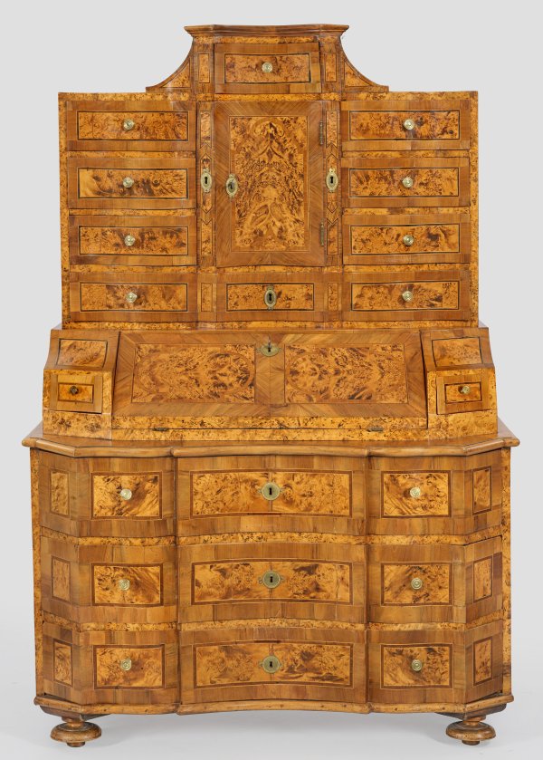 Nussbaum und helles Wurzelnuss, furniert. Gerader, querrechteckig angelegter Korpus auf schmaler Zarge und gedrückten Füßen. In der gegliederten Front drei breite, gegenläufig geschweifte und abgekantete Schubladen. Gering überstehende Deckplatte als Auflage für schräggestellte, abklappbare Arbeitsfläche, flankiert von Schubfächern. Oberhalb korrespondierender Aufsatz mit zentraler Tabernakeltür, umgeben von Schubladen mit podestförmigem, einschübigem oberen Abschluss. 190 cm. 128 cm x 65 cm.