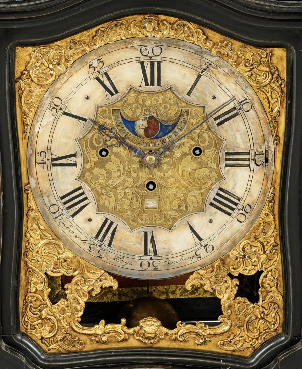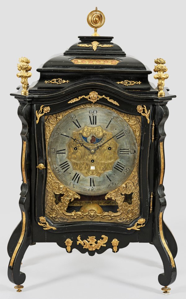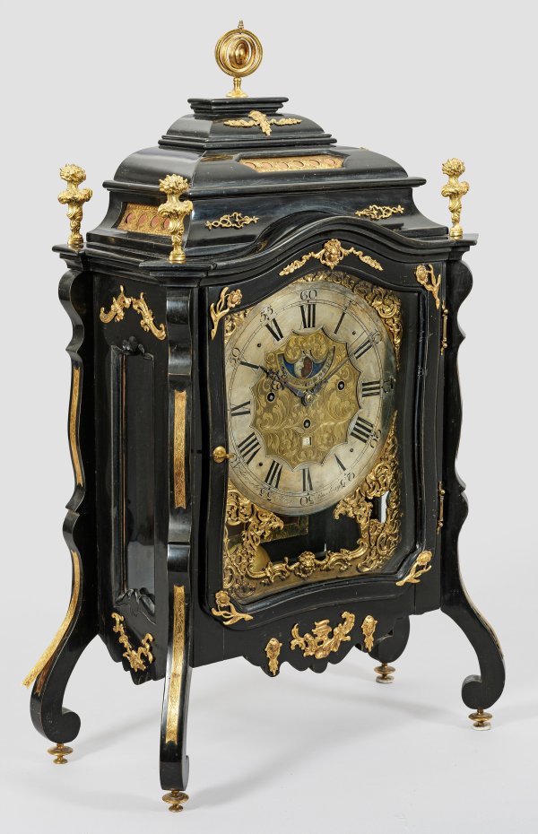 Holz, ebonisiert sowie Applikationen aus vergoldetem Messing. Hochrechteckiges, dreiseitig verglastes Uhrengehäuse, flankiert von schräggestellten, ausgebogten Ecklisenen, in hohe Volutenbeine übergehend. Gestuft ansteigender oberer Abschluss mit Globusbekrönung sowie reliefplastischen Vasenmotiven. Aufwändig reliefiertes, durchbrochen gearbeitetes Zifferblatt mit appliziertem versilberten Ziffernring sowie reichem Dekor aus Volutenspangen, Datumsanzeige und Mondphase bez. Leopold Hoys Bamberg. Werk mit Ankerhemmung. Stundenschlag auf Glocke sowie Viertelstundenschlag mit Carillon aus acht Glocken. Repetition. H. 77 cm. 44 cm x 22 cm.