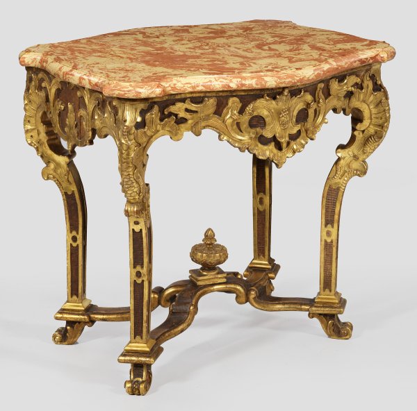 Holz, geschnitzt, nussbaumfarben gefasst und teilw. vergoldet. Passig geschweifte Zarge aus üppigen, erhaben reliefierten Rocaillen, auf hohen gekanteten Beinen mit Schuppendekor, unterhalb durch geschwungene Stege mit Balusterbekrönung verbunden. Korrespondierende, gering überstehende Deckplatte aus creme- und roséfarben gemasertem Stuckmarmor. H. 78,5 cm. 85 cm x 75 cm.