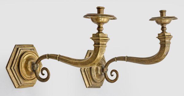 1-flg.; Bronze. An sechseckigem Wandschild runder Ansatz, davon ausgehend volutenförmiger, sechseckiger Leuchterarm mit mehreren Profilringen, ausgestelltem Tropfenfänger und becherförmiger Tülle. Ehemals elektrifiziert. Wandschild ergänzt. Rest., Riss. L. 48 cm.