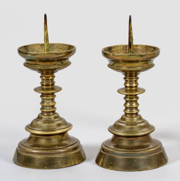 A pair of German Baroque brass candlesticks. Minor chipped.
