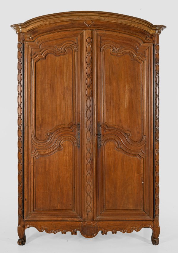 Nussbaum, reliefplastisch geschnitzt. Gerader, hochrechteckiger Korpus mit gerundeten Ecklisenen. In der gegliederten Front zwei hohe, kassettierte Türen mit reliefierten Volutenmotiven. Segmentförmiger oberer Abschluss und vorkragendes Profilgesims. Erg.; H. 265 cm. 170 cm x 68 cm.