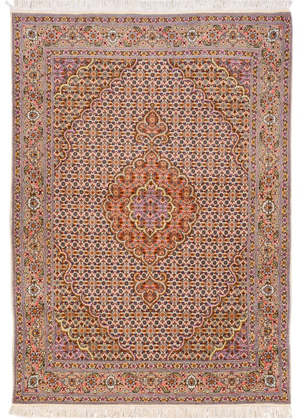 Persien. Korkwolle mit Seide auf Baumwolle. Im cremefarbenen Innenfeld großes Zentralmedaillon mit Anhängern sowie flächendeckende Heratimusterung. Umlaufend breite Bordüre aus Palmettenranken, begrenzt von schmalen Bändern. 108 cm x 160 cm.