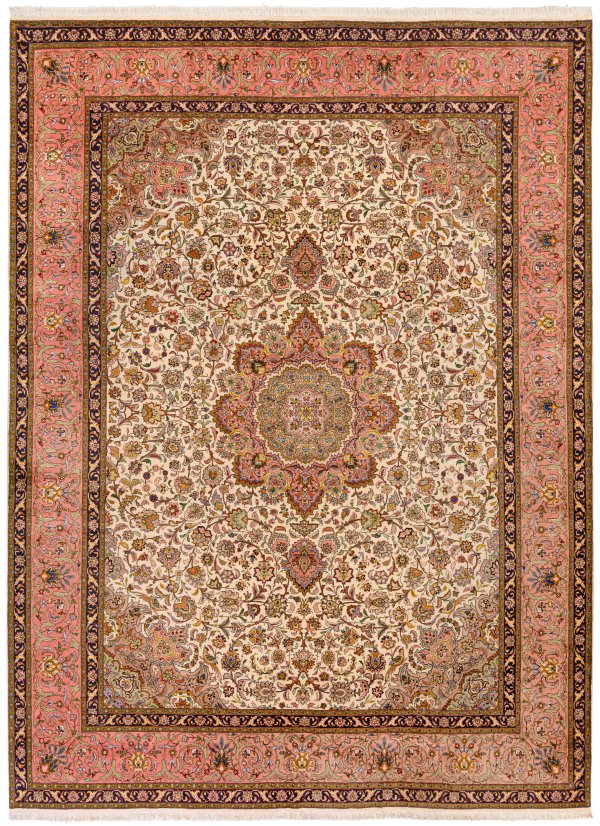 Persien. Wolle mit Seidenhighlights auf Baumwolle. Im elfenbeinfarbenen Innenfeld großes Zentralmedaillon mit Anhängern sowie entsprechende Ecklösungen. Flächendeckende Musterung aus Rankenwerk. Umlaufend breite, roséfarbene Bordüre aus Palmettenranken, begrenzt von schmalen Bändern. 395 cm x 300 cm.