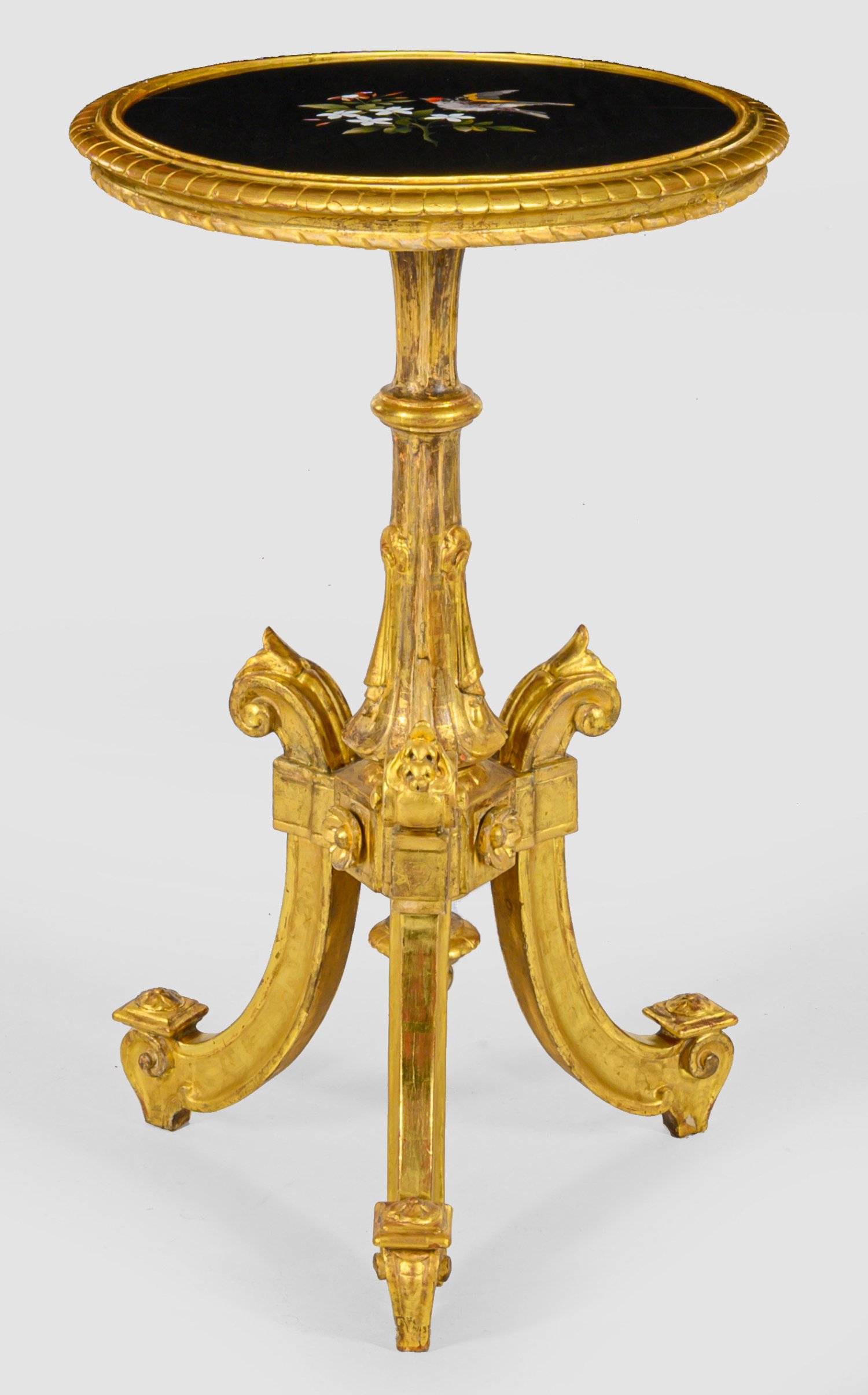 Holz, geschnitzt, gefasst und vergoldet sowie Einlagen aus unterschiedlichen Marmor- und Achatsorten auf schwarzem Fond. Mehrfach gegliederter, sich konisch verjüngender Balusterschaft auf gegeneinander gestellten Voluten als Träger für runde, profilgerahmte Deckplatte. In der Mitte eingelegter Blütenzweig mit naturalistisch gestaltetem Vogel. H. 77 cm. D. 47 cm.