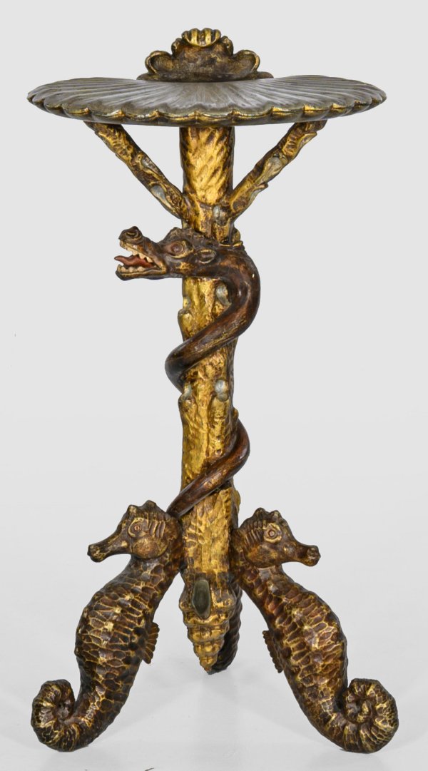 Holz, geschnitzt sowie dunkelbraun, gold- und silberfarben gefasst. Über schräggestellten, plastischen Seepferdchen naturalistisch gestalteter Korallenast, umwunden von einer Seeschlange. Oberhalb flache Deckplatte in Form einer Jakobsmuschel. Rest.; H. 87 cm.