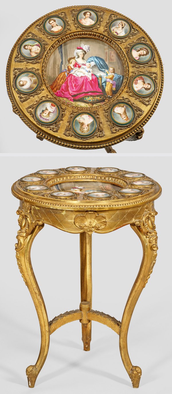 Holz, stuckiert und goldfarben gefasst sowie Porzellan, polychrom bemalt. Passig geschweifte Zarge mit applizierten Rocaillen auf stark geschwungenen Volutenbeinen. Gering überstehende Deckplatte mit umlaufendem Fries aus Perlstab. In der Mitte tief eingelassenes Porzellanbecken mit der Darstellung Marie Antoinettes mit ihren Kindern nach Elisabeth Vigée-Lebrun, sign., W. Schidler. Umlaufend korrespondierende von Volutenspangen begrenzte Porträtmedaillons u.a. mit Darstellungen von Margarethe von Dänemark, Königin Luise, Sophie Potocka und Gabrielle d'Estrées. H. 74 cm. D. 52 cm.