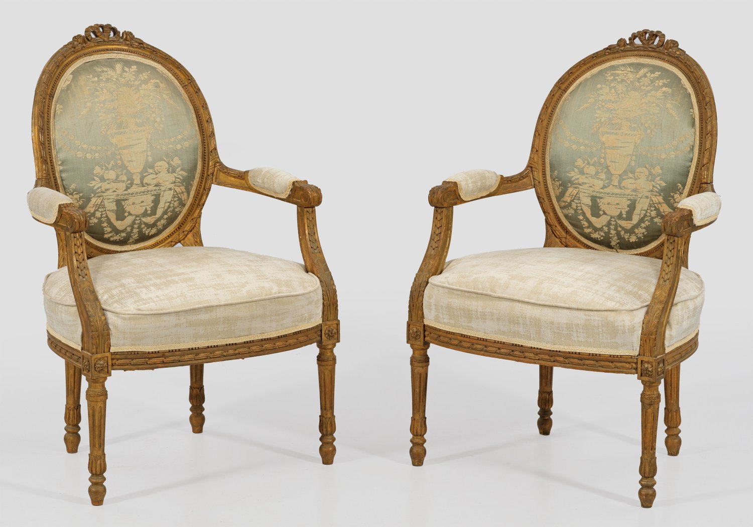 Holz, geschnitzt, gefasst und vergoldet. Bombierte Zarge auf kannelierten Balusterbeinen. Geschweift ansteigende Stützen für schmale Armlehnen. Medaillonförmige Rückenlehnenrahmung mit Schleifenbekrönung. Sitz-H. 45 cm.
