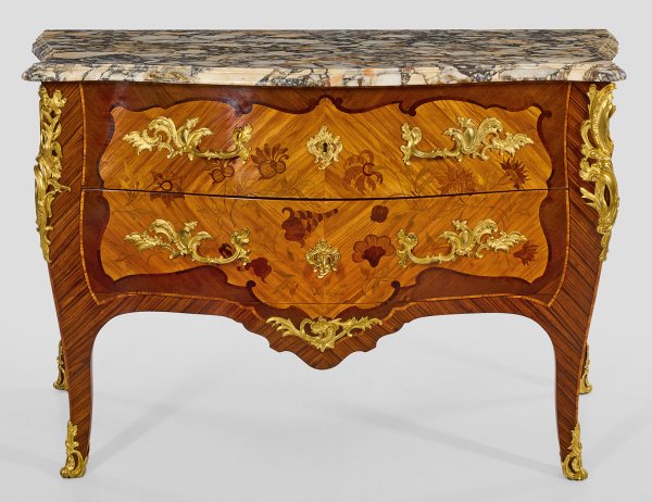 Palisander und Rosenholz, furniert sowie Einlagen aus unterschiedlichen Edelhölzern. Dreiseitig bombierter Korpus, flankiert von schmalen Ecklisenen, in leicht ausgestellte Beine übergehend. In der gegliederten Front zwei optisch verbundene Schubladen sans traverse. Flächendeckend kartuschenförmige Furnierfelder mit Blütenintarsien. Vergoldete Bronzeapplikationen sowie profilierte Deckplatte aus cremefarben und grau gemasertem Marmor, minim. rest.; H. 84,5 cm. 130 cm x 65 cm.