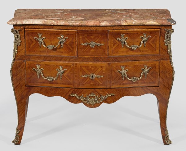 Rosenholz, furniert. Dreiseitig bombierter Korpus, flankiert von schlanken, ausgezogenen Ecklisenen, in geschweifte Beine übergehend. In der gegliederten Front vier Schubladen unterschiedlicher Größe. Flächendeckend gespiegelt angeordnete Furnierfelder. Gering überstehende, profilierte Deckplatte aus roséfarben und grau gemasertem Marmor. H. 88 cm. 115 cm x 53 cm.