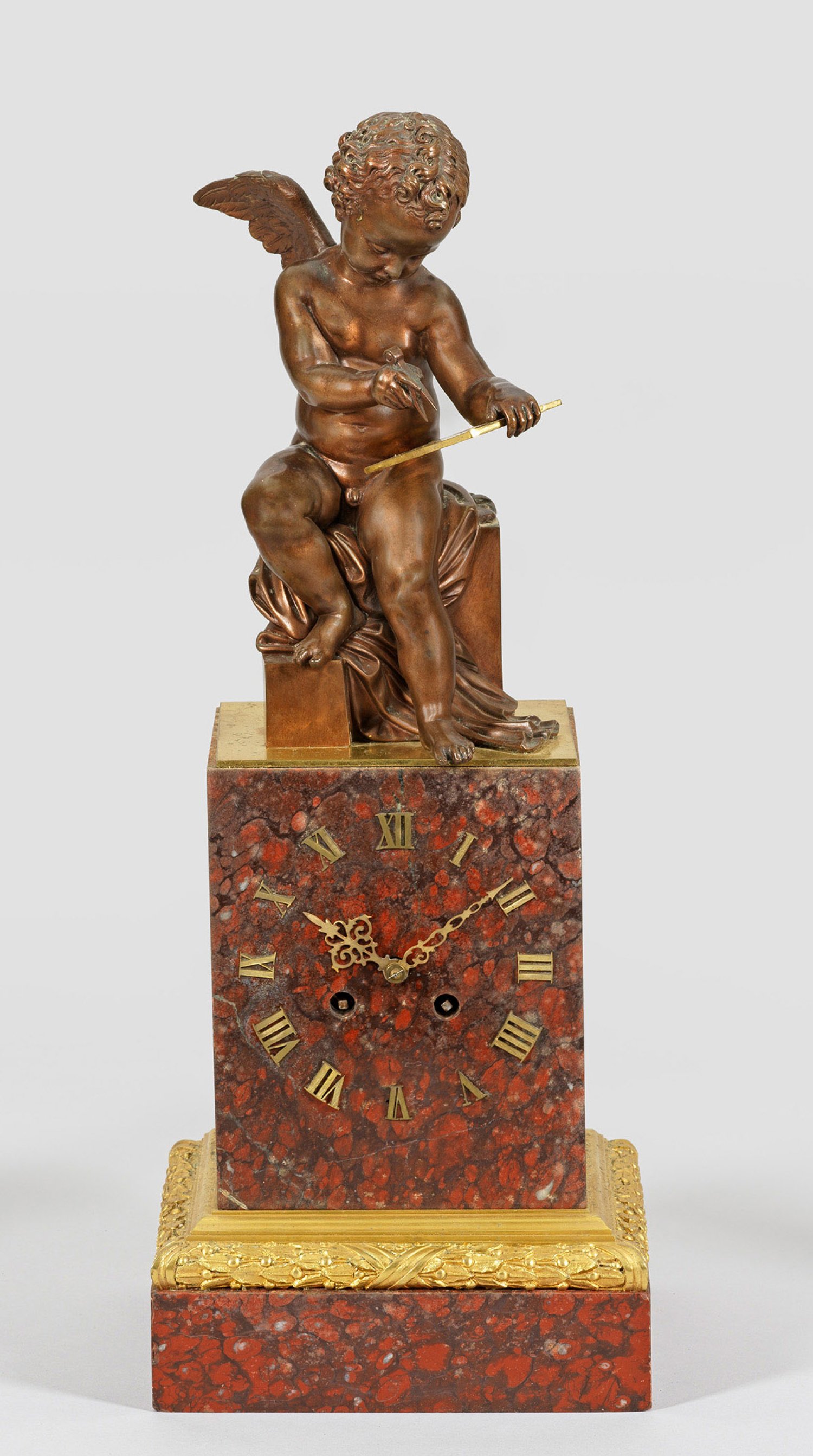 Bordeauxrot gemaserter Marmor sowie Bronze, patiniert und teilw. vergoldet. Auf hochrechteckigem Uhrengehäuse mit applizierten Ziffern und umlaufendem Lorbeerfries, vollplastische Darstellung eines Puttos mit Zirkel. Pendulenwerk mit Fadenaufhängung und Halbstundenschlag auf Glocke. Pendel fehlt. H. 46 cm.