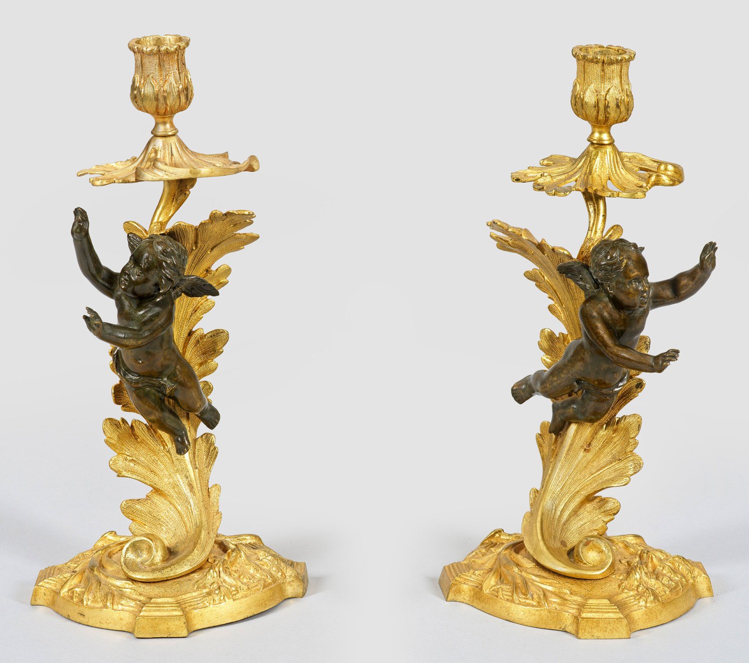 Gegenstücke. 1-flg.; Bronze, vergoldet und teilw. dunkel patiniert. Über kartuschenförmigem Sockel geschwungenes Lanzettblatt sowie vollplastische Puttenkinder als Träger für blütenförmige Tüllen. Verschlossene Bohrung für Elektrifizierung. H. 30 cm.