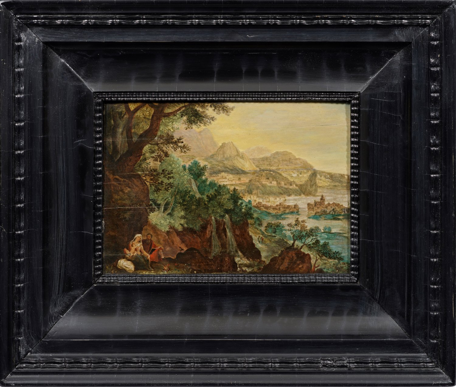 In fein lasierender Malweise ausgeführte, detailreiche, tiefenräumlich geschilderte Landschaft mit Luftperspektive. Auf der linken Seite die auf einer felsigen Anhöhe unter einem Baum rastende Heilige Familie, im Mittelgrund geht der Blick auf reißende Wasserfälle, dahinter öffnet sich die Landschaft auf der rechten Bildseite zu einer erkennbaren Hafenstadt. Das Gemälde geht auf einen Kupferstich des flämischen Künstlers Egidius (Aegidius) Sadeler (um 1570 - 1629) zurück, der seit 1595 in München tätig war und dann 1597 an den Hof Kaiser Rudolf II. nach Prag ging (später arbeitete er auch unter Kaiser Matthias und Ferdinand II.). Sadeler verwendet für seinen Kupferstich eine Vorlage von Jan Brueghel d. Ä. aus der Zeit um 1596/97, wie ein Vergleich mit der Waldlandschaft mit dem "Hl. Hieronymus" (von Jan Brueghel und Hans Rottenhammer, wahrscheinlich 1597) in der Alten Pinakothek in München und die datierte Zeichnung "Berglandschaft mit Hafenstadt" Breughels aus dem Jahr 1596 im Museum Boijmans Van Beuningen in Rotterdam zeigt. Öl/Holztafel. M. u. bez. "P. BREUGHEL". 20,3 cm x 28,5 cm. Rahmen.