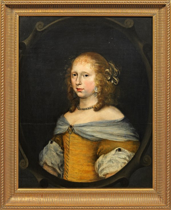 In ein kartuschengerahmtes Oval komponiertes Brustbildnis der blonden Adeligen mit goldgelbem und hell taubenblauem Kleid, den Kopf ins Halbprofil gewendet. Das repräsentative, höfische Porträt lässt sich mit einer Reihe von stilistisch vergleichbaren Damenbildnissen van Honthorsts vergleichen, die sich insbesondere in den Sammlungen des Instituut Collectie Nederland und Rijksmuseums in Amsterdam, im Rijksdienst voor het Cultureel Erfgoed in Amersfoort sowie in der Staatl. Gemäldegalerie in Berlin befinden. Van Honthorst war ein Schüler Abraham Bloemaerts, vollendete aber seine Ausbildung in Rom, wo er (etwa zwischen 1610 und 1620) besonders Caravaggios Werke studierte. Dort arbeitete er für bedeutende Auftraggeber, begegnete Guido Reni und arbeitete mit ihm zusammen. 1620 kehrte er nach Utrecht zurück, wurde 1622 Mitglied der Malergilde und 1623 deren Vorsteher. Er trat in Dienste des Oranierhofes und übernahm zahlreiche Porträtaufträge für das im Exil lebende böhmische Königspaar Elisabeth Stuart und Friedrich V. von der Pfalz. 1628 reiste er für Aufträge König Karl I. von England nach London. 1637 trat er in die Malergilde des Haag ein, wo er bis 1652 tätig war und dort sein zweites Atelier eröffnete. Die Prinzen von Oranien, Friedrich Heinrich und Wilhelm II.,ernannten ihn zum Hofmaler und gaben ihm zahlreiche Aufträge. Öl/Eichenholztafel. 69,5 cm x 56 cm. Rahmen.