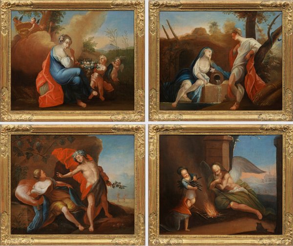Szenische Darstellungen die Jahreszeiten repräsentierenden, mythologischen Götterfiguren in südlichen Landschaften: der "Frühling" mit der Göttin Flora und Engeln; der "Sommer" mit einer Quellnymphe und der Göttin Ceres sowie deren Attributen Ährenkranz, Ährengarben und Schlange; der "Herbst" mit dem Gott Bacchus als Jüngling mit Weintrauben und -reben sowie ruhender weiblicher Figur; der Winter als frierende, ältere, männliche, geflügelte Götterfigur, dem zwei Putti ein wärmendes Feuer entfachen. Bisher nicht dokumentierte Frühwerke Enderles mit außergewöhnlicher weltlicher Thematik. Der Künstler lernte bei seinem Onkel Anton Enderle aus Günzburg (1700 - 1761) und gehört zu den besten Malern des schwäbischen Rokoko. Seit 1753 wurde Enderle ein gefragter Maler für religiöse Themen, besonder nachdem er 1755 er eine eigene Malerwerkstattt in Donauwörth übernahm, führte danach zahlreiche bedeutende Aufträge zur malerischen Ausstattung von Kirchen durch Altarbilder und Fresken aus. Öl/Lwd., teilw. doubl.; Das Gemälde mit Winter-Szene verso sign. u. dat. 1749. Teilw. Etiketten des Kunsthändlers Siegfried Kuhnke, München, 36. Deutsche Kunst- und Antiquitäten-Messe München 1991. Jeweils 58 cm x 72 cm. Rahmen.