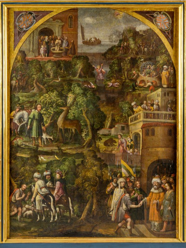 Simultane, über- und nebeneinander gestaffelte Darstellung der verschiedenen Legenden-Episoden des Eustachius, dem frühchristlichen Märtyrer (gestorben um 118 unter Kaiser Hadrian). Großformatiges Andachtsbild mit halbrundbogenförmiger Komposition, in den beiden Zwickeln jeweils ein Renaissance-Schild. Im Bildfeld wird der Betrachter in der Tradition spätgotischer Heiligenbilder visuell durch die Gleichzeitigkeit und die Fülle an Details in den Einzelszenen überwältigt, so dass er in diesem "Wimmelbild" nicht zugleich das große Ganze der Bildkomposition wahrnehmen kann. Die Legende berichtet vom Jäger und Heerführer Eustachius in einer Legion in Kleinasien unter Kaiser Trajan. Bekehrt wurde er bei der Jagd, als ihm ein Hirsch mit leuchtendem Kruzifix zwischen seinem Geweih und später Christus selbst erschien. Daraufhin ließ er sich mit seiner Familie taufen, bestieg mit dieser ein Schiff nach Ägypten, wurde ins Meer gestürzt, konnte sich aber an Land retten. Bei der Überquerung eines Flusses riss ein Wolf den einen Sohn, ein Löwe den anderen mit sich, vertrieben durch Hirten und Bauern, welche die Söhne aufnahmen. Eustachius verdingte sich, getrennt von seiner verschleppten Frau und Kinder, als Knecht. Der von Feinden bedrängte Kaiser Trajan ließ über 15 Jahre nach Eustachius suchen, schließlich fanden ihn Ritter und führten ihn mit großen Ehren zurück (Szenen links und rechts unten). Nachdem sich jedoch Eustachius mit seiner Familie weigerte an der Opferfeier nach einem Sieg teilzunehmen, ließ ihn Trajans Nachfolger Kaiser Hadrian einem Löwen vorwerfen (der sich aber nur vor Eustachius verneigte) und schließlich verbrennen (Szene rechts oben mit Gottvater und der Taube des Heigen Geistes). Öl/Lwd., doubl; 150,5 cm x 114 cm. Rahmen.