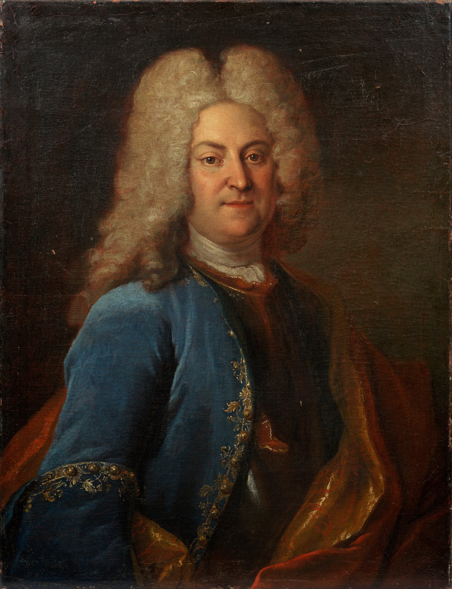 Repräsentatives, höfisches Bildnis des Adeligen im Viertelprofil, seinem Stand entsprechend mit reich besticktem blauen Justaucorps (über einem Brustharnisch) und opulenter Allonge-Perücke. Der dargestellte Baron de Gaultier (1678 - 1742) stammte aus einer französischen Hugenottenfamilie, sein Vater François Gaultier gehörte zu den Räten des Großen Kurfürsten in Brandenburg. Er selbst wurde in Genf geboren und stand zunächst ebenfalls in brandenburgischen Diensten, bevor er um 1715 an den Hof August des Starken nach Dresden ging. In den 1710er bis 1730er Jahren kam Gaultier im Politik- und Kulturbetrieb des königlich-kurfürstlichen Hofes eine zentrale Bedeutung zu. Durch ein "Speziaireskript" wurde der "Accisrat" Pierre Gaultier 1716 zum "Hof- und Justitienrat und Geheimen Referendario" ernannt und 1723 sogar zum "Wirklichen Geheimen Kriegsrat" befördert. 1721/22 erfolgte seine Erhebung in den Reichsfreiherrenstand. Von 1729 bis 1733 (oder 1727 bis 1735) stand er als "Directeur de plaisirs" der Kurfürstlich-Sächsischen und Königlich-Polnischen Kapelle (heute: Sächsische Staatskapelle Dresden) vor. In dieser Position war er u. a. für die Bestallung zahlreicher Hofbediensteter wie Kammerherren, Musiker, Theater- und Ballettpersonal zuständig. Zu seinen unzähligen Korrespondenzpartnern zählte aber auch der Hofmaler Louis de Silvestre. So kam für den Baron auch nur Louis de Silvestre als Porträtmaler in Frage, um ihn mit dem vorliegenden Bildnis zu beauftragen. 1716 hatte August der Starke Silvestre nach Dresden berufen, wo er bis 1748 wirkte, zum Oberhofmaler ernannt und geadelt wurde. Er schuf eine Fülle von Porträts des Königs, des Hofes und des Adels, 1727 wurde er Direktor der Malerakademie in Dresden. Öl/Lwd.; Verso Angaben zum Dargestellten und Bez. "peint par Silvestre 1723". 81,5 cm x 63,5 cm.