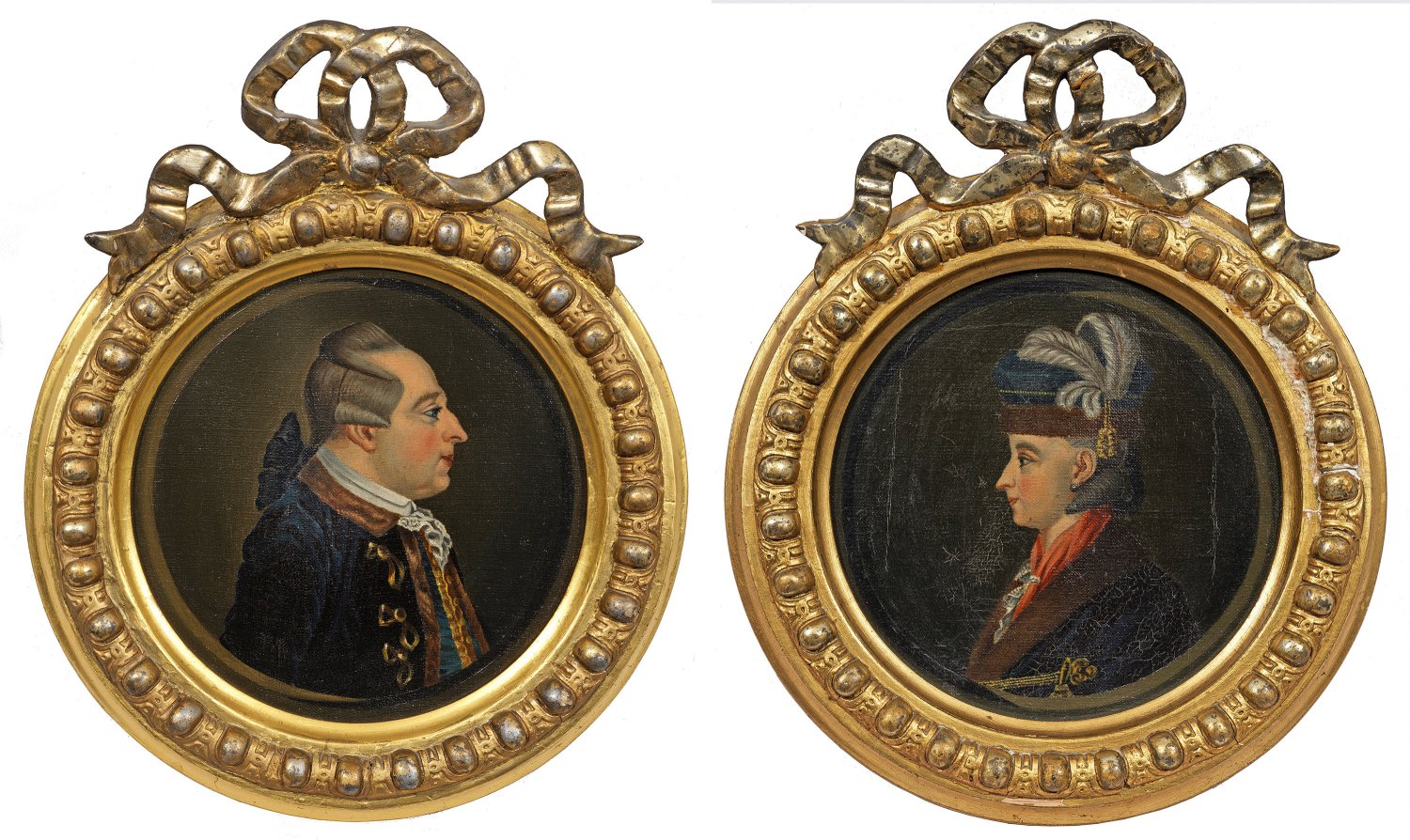 Gegenstücke. Tondo-Brustporträts von Heinrich August Geldern (1730 - 1801; Fürstlich Reußischer Hofrat und Amtmann auf Schloss Burgk, Schleiz) und seiner Frau Wilhelmine Renate Geldern geb. Ackermann (1741 - 1813). Öl/Lwd.; Verso jeweils mit Bleistift sign. u. dat. 1899 sowie bez. mit Angaben zu den Dargestellten. D. 22,5 cm. Original-Rahmen.
