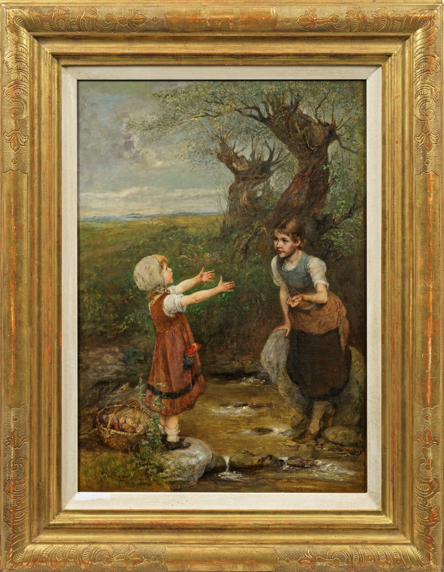 Szenische Darstellung an einem kleinen Bach, bei dem ein junges Mädchen mit schwerem, gefülltem Korb ihre ältere Schwester um Hilfe beim Überqueren bittet und ihr die Arme entgegenstreckt. Anrührendes Werk des auf Kindermotive spezialisierten Malers, der an der Karlsruher Kunstschule bei Karl Friedrich Schick und Ludwig Des Coudres sowie an der Münchener Akademie bei Wilhelm von Diez studierte. Keyser stellte u. a. im Münchener Glaspalast aus, überdies erschienen seine Bilder in den populären Zeitschriften "Gartenlaube" und "Über Land und Meer". Öl/Lwd., doubl.; L. u. sign. mit Ortsangabe München. 55 cm x 39 cm. Rahmen.