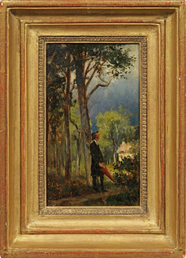 Anekdotisches, von Carl Spitzweg beeinflusstes Kabinettbild. Rasch studierte 1866-1869 in Karlsruhe bei Hans Gude, 1870 ging er nach München, wurde Schüler von Arthur von Ramberg und besuchte seit 1872 die Kunstakademie. Rasch, der 1875 einer der Begründer der Ekensunder Künstlerkolonie war, ging 1878 für eine längere Zeit nach Paris. 1891 veranstaltete der Münchener Kunstverein eine umfassende Ausstellung (später größtenteils von der Kieler Kunsthalle übernommen). Der Kunstschriftsteller Adolf Rosenberg stellte ihn 1884 an die Spitze der jüngeren Talente der Münchener Kunst. Im Münchner Glaspalast fand 1914 eine Nachlass-Ausstellung statt. Öl/Holztafel. R. u. Ligatur-Monogramm "HR" mit Dat. 1874. 16,5 x 9,5 cm. Rahmen.