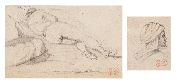 Die beiden Studien gehören zum bedeutenden Oeuvre an Zeichnungen Delacroixs, dem Begründer der Orientmalerei. Während einer Nordafrika-Reise nach Marokko und Algerien im Jahr 1832 füllte Delacroix sieben Skizzenhefte mit circa 1000 Zeichnungen, Aquarellen und Notizen. Diese dienten ihm bis zu seinem Tod als Basis für die Beschäftigung mit dem Orient und für 80 Meisterwerke der Orientmalerei, darunter das berühmte Gemälde "Die Frauen von Algier" von 1834 (seit 1874 im Louvre). Aquarell und Bleistift/Papier, kaschiert auf Papier. R. u. Nachlass-Monogramm-Stempel "E.D" in Rot (Lugt 838a). 5 cm-6,7 cm x 3,9 cm-10,6 cm.
