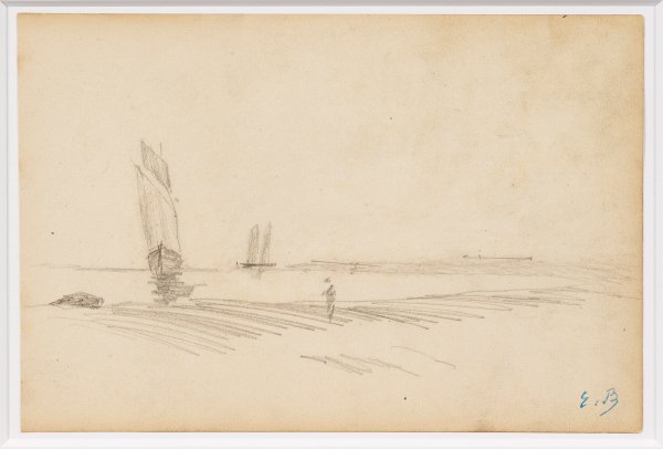 Mit schnellen, sicher gesetzten Strichen ausgeführte Studie Boudins, dem bedeutenden Wegbereiter des Impressionismus. Dieser gehörte nach 1850 zu einer Künstlerkolonie bei Honfleur, der sich auch Gustave Courbet, Johan Barthold Jongkind und der junge Claude Monet anschlossen. 1874 nahm er an der ersten Impressionisten-Ausstellung in Paris teil, die außer von Monet u. a. von Paul Cézanne, Edgar Degas. Camille Pissarro, Pierre-Auguste Renoir und Alfred Sisley beschickt wurde. Bleistift/Papier. R. u. blauer Monogramm-Stempel (Lugt 828). 15,9 cm x 23,5 cm.