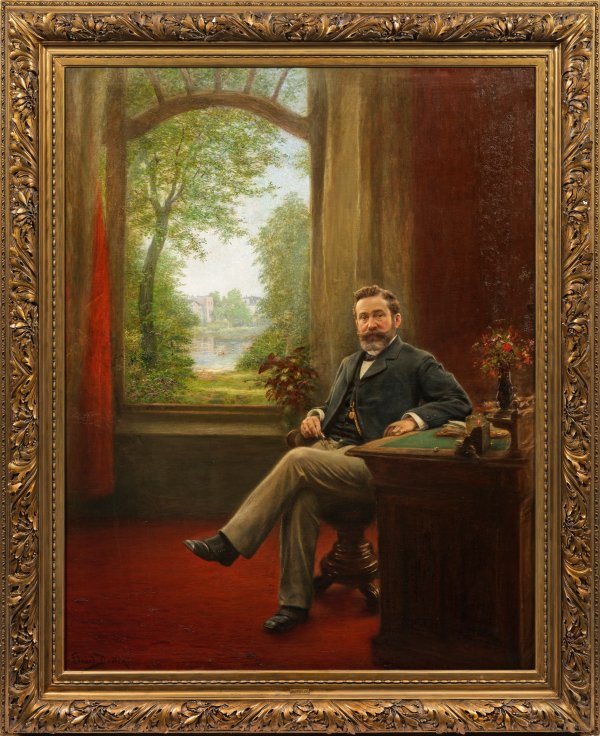 Ganzfigurige, repräsentative, realistische Darstellung vor einem Fenster mit Landschaftsausblick auf einen Park. Daelen studierte 1868/69 an der Kunstakademie Düsseldorf, ging dann an die Berliner Akademie und setzte sein Kunststudium bis 1875 an der Münchner Kunstakademie fort, wo Otto Seitz und Wilhelm von Diez seine Lehrer waren. Nach kurzem Aufenthalt in Rom (März 1875) ließ er sich 1875 in Düsseldorf nieder, wo er 1877-1923 Mitglied des Künstlervereins Malkasten war. Sein Oeuvre umfasst vor allem Allegorien, patriotische Bilder und Porträts, mit denen er besonderen Erfolg hatte, u. a. Bildnisse des deutschen Kaisers Wilhelm I. (gezeigt 1893 in der Großen Berliner Kunstausstellung) und des Reichskanzlers Otto Fürst von Bismarck. Öl/Lwd.; L. u. sign.; 151 cm x 120 cm. Rahmen.