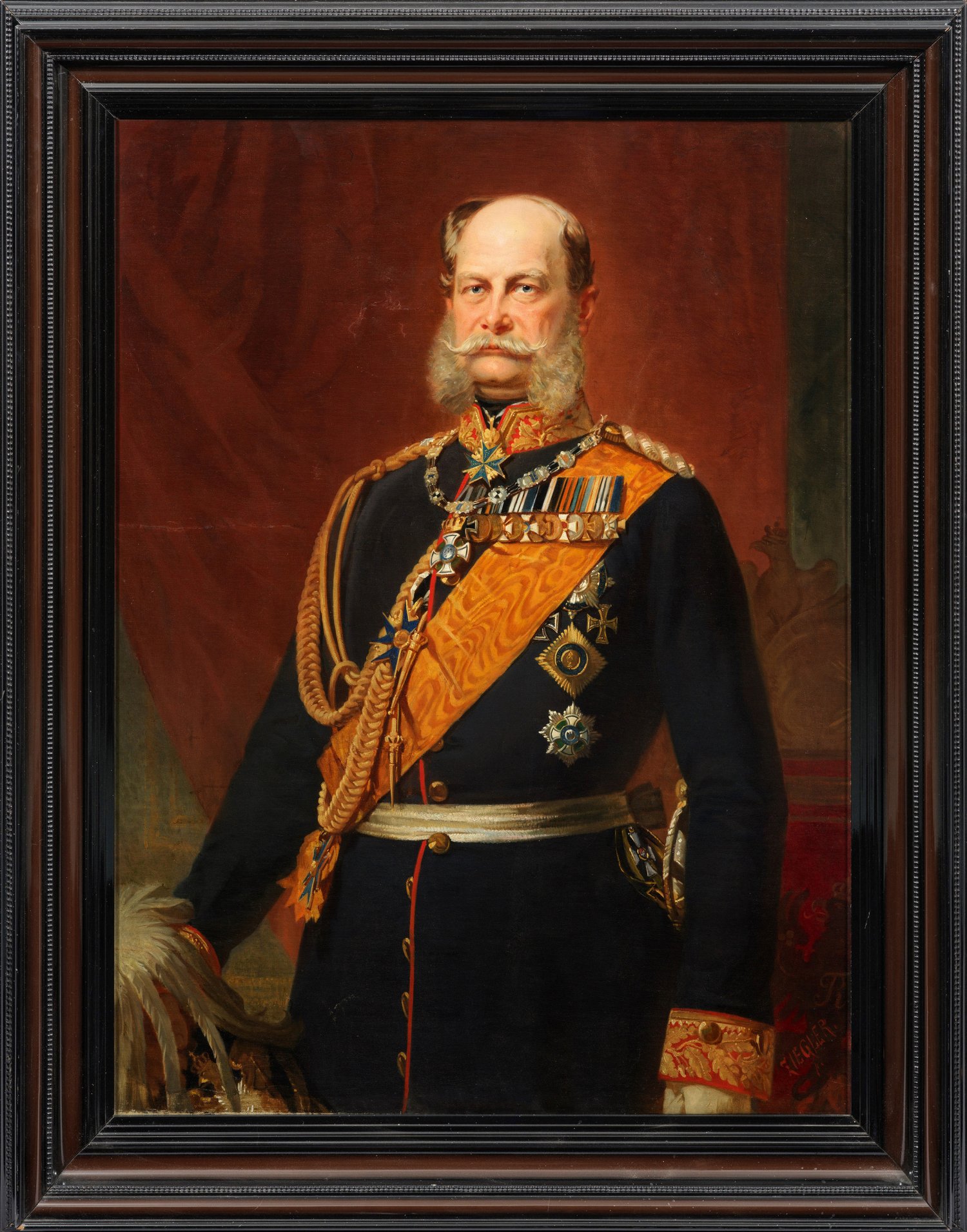 Repräsentatives, lebensgroßes, ausdrucksvoll charakterisierendes Hüftstück mit Bildnis Wilhelm I. (1797 - 1888) in dunkelblauer Uniform mit orangeroter Schärpe des Schwarzen Adlerordens, geschmückt mit zahlreichen hohen Orden und einer Ordensspange. Ziegler war einer der besten Porträtisten der Berliner Malerschule. Er studiert seit 1845 an der Kunstakademie und beschickte seit 1856 die Ausstellungen der Akademie, 1893-1910 auch die Großen Berliner Kunstausstellungen. Als gefragter Porträtmaler schuf er u. a. Bildnisse Wilhelms I., darunter als Auftragsarbeit auch ein Staatsporträt des preußischen Königs und deutschen Kaisers in Krönungsmantel und mit Krönungsinsignien. Ein Bildnis Friedrichs III., das Ziegler für das Oberlandesgericht Königsberg gemalt hatte, erwarb Wilhelm II. 1890 zur Ausstattung des Berliner Stadtschlosses. Öl/Lwd., doubl.; R. u. sign.; 116,5 cm x 89 cm. Rahmen.