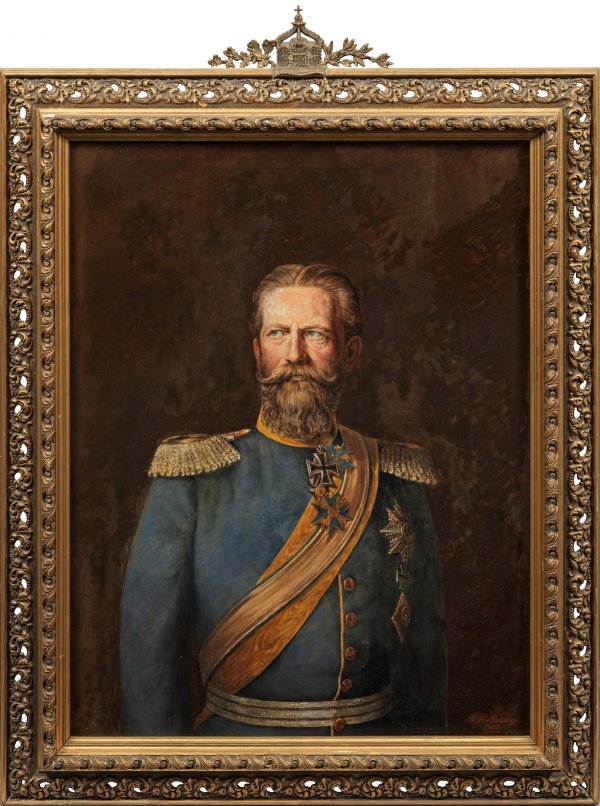 Repräsentatives, lebensgroßes, halbfiguriges, ausdrucksvoll charakterisierendes, posthumes Bildnis Friedrich III. (1831 - 1888) in Uniform mit Ordenschärpen und zahlreichen Orden, darunter der Bruststern des Schwarzen Adlerordens und der Orden "Pour le Merité", vor neutralem, braunen Hintergrund, der Kopf fast en face. Öl/Lwd.; R. u. sign. u. dat. 1905. 100,5 cm x 80 cm. Durchbrochen gearbeiteter Original-Prunkrahmen, bekrönt von der heraldischen Kaiserkrone des preußisch-deutschen Kaisers in modifizierter Form ab 1889 (aus Bronze).
