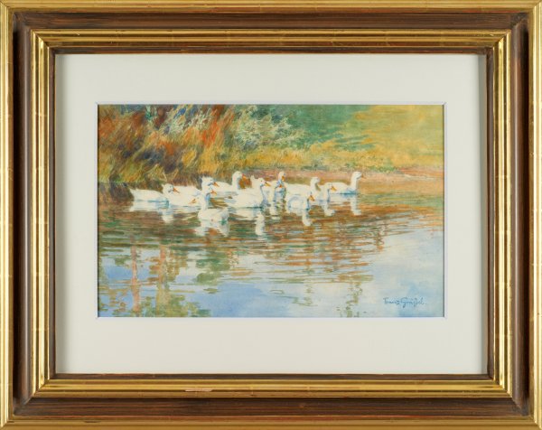 Impressionistische, spätsommerliche Seeidylle mit zwölf subtil geschilderten, weißen Enten. In Stil- und Motiv repräsentative Arbeit Gräßels, der an der Karlsruher und Münchener Kunstakademie ausgebildet wurde und anschließend zu Studien nach Obersasbach zurückkehrte. Zeitgleich wandte sich Gräßel Tiermotiven zu und fand rasch in der Darstellung von Enten seine Hauptmotive, die vielfach prämiert wurden. 1900 wurde Gräßel in Emmering bei Fürstenfeldbruck ansässig, wo sich eine Künstlerkolonie gebildet hatte, die als "Brucker Maler" bekannt wurde. Aquarell/Papier. R. u. sign.; 29 cm x 47,5 cm (Passepartoutausschnitt). Rahmen.