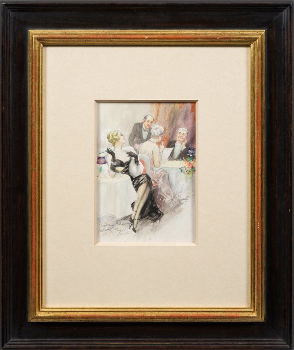 Humorvolle, satirische Szene im berühmten Brassier-Restaurant Fouquet's in Paris mit älterem Ehepaar an einem Tisch, zu dem eine junge, elegante Dame vom Nebentisch herüberlacht und dem Herrn mit bissigem Kommentar gratuliert: "Prosit zum Geburtstag - Wilhelm!! The Trio". Das eine aufdeckende Affäre illustrierende Blatt ist eine späte Reminiszenz an seine künstlerischen Anfänge. Cucuel kam mit 17 Jahren zum Kunststudium nach Paris. Dort und seit 1899 auch in Berlin, setzte er seine bereits in den USA begonnene Karriere als freiberuflicher Illustrator fort, arbeitete u. a. für Zeitschriften wie "Le Figaro", "L’Illustration", "The Illustrated London News", "Illustrierte Zeitung", "Moderne Kunst" etc.; 1907 wurde er in München ansässig, wo er auch als Maler reüssierte, sich der Künstlergruppe "Die Scholle" und Leo Putz anschloss. Er stellte im Glaspalast und in der Münchener Secession aus, 1915 erhielt er auf der Weltausstellung in San Francisco eine Silbermedaille. 1939 kehrte Cucuel in die USA zurück. Aquarell, Gouache, Weißhöhungen u. Bleistift/Papier. R. u. sign.; l. u. dat. "Oct.1.(19)49". 23,5 cm x 17 cm (Passepartoutausschnitt). Rahmen.