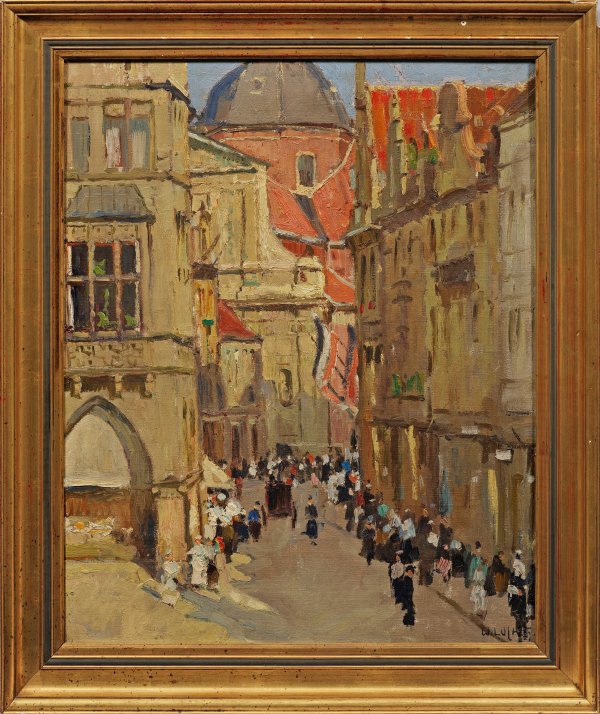 Mit breitem, schnellem, weich-pastosem Duktus gemalte, impressionistische Vedute, belebt durch zahlreiche Figuren auf der Straße. Lucas studierte 1904-1906 an der Düsseldorfer Kunstakademie. Er wurde vom deutschen und französischen Impressionismus beeinflusst, insbesondere von Claude Monet, zumal er vor dem I. Weltkrieg längere Zeit in Frankreich verbrachte. Hierdurch hellte sich in den folgenden Jahren sein Kolorit auf, den Farben und dem Licht kam in seinen Werken eine immer größere Rolle zu. 1912-1914 bereiste er zudem Holland, Italien und Schweden. Zu seinen besten und schönsten Werken gehören Ansichten von München, Düsseldorf und anderen Städten. Öl/Lwd.; R. u. sign.; 75 cm x 61,5 cm. Rahmen.