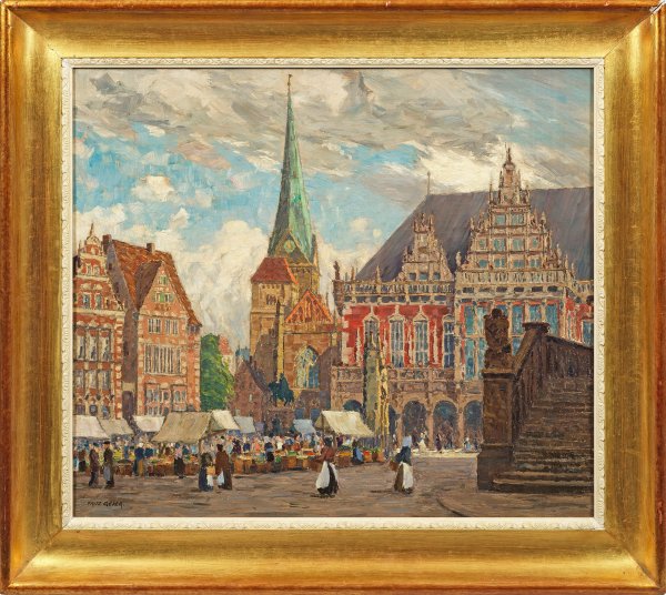 Belebter, sommerlicher Markttag in Alt-Bremen mit Blick in Richtung Rathaus und Liebfrauenkirche, auf der rechten Bildseite die Treppe der Neuen Börse (1955 abgerissen). Charakteristische, impressionistische Stadtansicht Geyers, 1894-1897 Meisterschüler Eugen Brachts an der Berliner Akademie. 1915-1943 war Geyer in Berlin-Steglitz ansässig und dort Mitglied der Malerkolonie. 1897-1934 nahm Geyer fast alljährlich an der Großen Berliner Kunstausstellung teil. Nach 1918 wurde Geyer zum Städtemaler, malte in ganz Deutschland, wodurch seine Veduten zugleich die Städte vor den Zerstörungen im II. Weltkrieg dokumentieren. Öl/Lwd.; L. u. sign.; Verso vom Künstler bez. u. betitelt mit Ortsangabe Berlin-Steglitz. 60,5 cm x 70,5 cm. Rahmen.