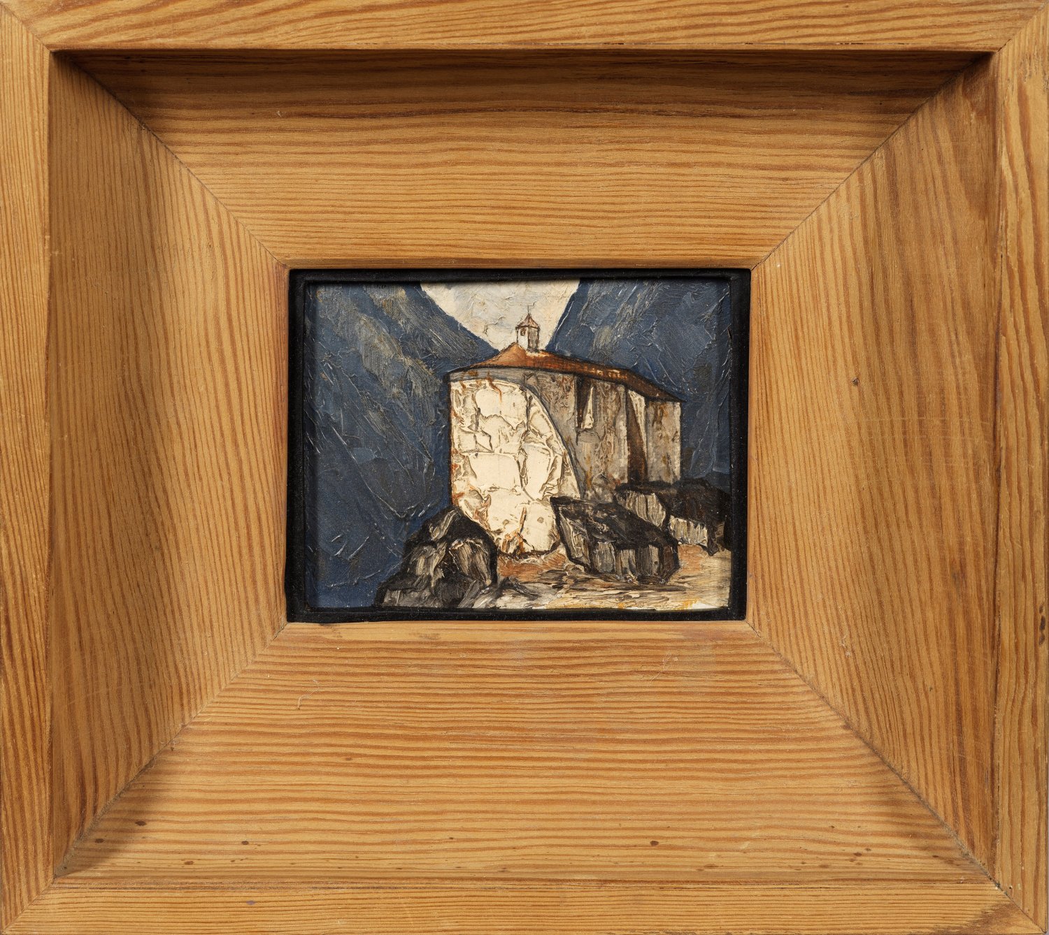 In kontrastierendem Kolorit und dynamischem, stark pastosem Duktus gemalte Schilderung einer von der Sonne beschienenen, steinernen Kapelle zwischen hochaufragenden, dunklen Felsmassiven des Tiroler Unterlandes. Charakteristische, kleinformatige Impression aus Mulleys Kufsteiner Schaffensperiode (1918-1934), in der er einen individuellen, in pastoser Spachteltechnik ausgeführten, flächigen Malstil für seine Alpenlandschaften entwickelte, bei denen er vornehmlich alte Berghöfe und Kapellen ohne Personenstaffagen spannungsreich inszenierte und die Erhabenheit der Hochgebirgswelt zum Ausdruck brachte. Hierdurch erneuerte er die Gebirgsmalerei im 20. Jh. in moderner Weise. Öl/Karton. Verso zweifach Künstlerstempel mit Ortsangabe Kufstein. 10 cm x 12 cm. Rahmen.