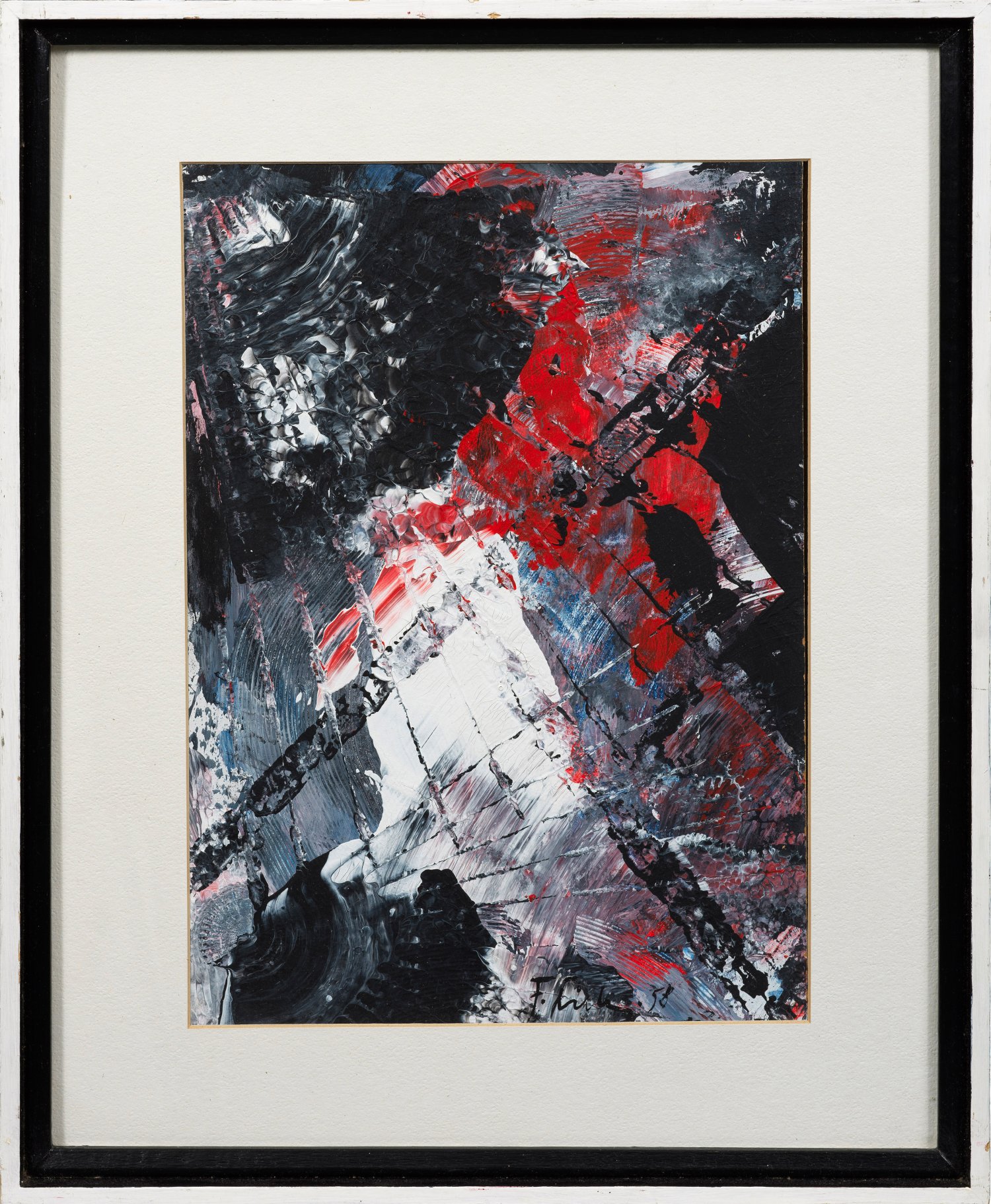 Mit furiosem Duktus gestaltete Spachtelarbeit des bedeutenden Informel-Künstlers, das die Dynamik des Malprozesses anschaulich werden lässt. 1946-1950 studierte Thieler an der Akademie in München, wo er seine ersten abstrakten Bilder malte. Zusammen mit Willi Baumeister und Fritz Winter gründete Thieler 1949 die Avantgarde-Künstlergruppe "ZEN 49". 1951-1953 in Paris tätig, gehören Hartung, Soulages und Poliakoff zu seinen Künstlerfreunden. 1959 und 1964 stellte er auf der "documenta" in Kassel aus. Acryl/Masonit. Sign. und dat. (19)58. Verso bez. und nochmals dat. 1958. 39 cm x 28,1 cm. Rahmen.