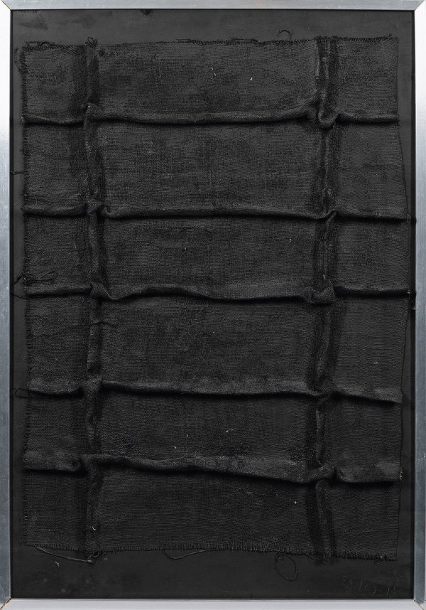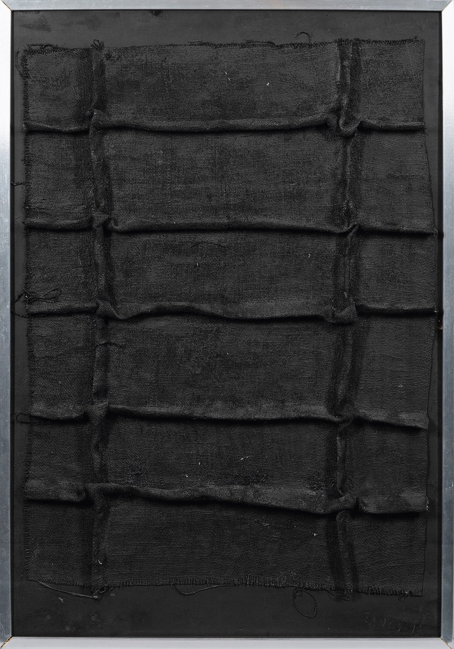Abstrakte, charakteristische Arbeit aus dem Jahr 1975 mit netzgitterartiger, horizontaler und vertikaler, reliefierter Faltung, in der Zangs Zwei- und Dreidimensionalität zum Mittel kinetischer Kunst werden lässt. 1945-1950 studierte Zangs an der Kunstakademie Düsseldorf, 1953 entstanden erste Reliefbilder. Seit den 1950er Jahren wurde Zangs ein Wegbereiter der Arte Povere, der abstrakten Malerei und der minimalistischen Kunst in Deutschland, der durch seine vielfältigen Collagen, Materialexperimente, Faltungen, "Scheibenwischer"-Bilder (seit 1957) und berühmten "Verweißungen" bekannt wurde. Hiermit gehört er neben den Mitgliedern der ZERO-Bewegung - Helmut Mack, Otto Piene und Günter Uecker sowie Joseph Beuys - zu den bedeutendsten deutschen, zeitgenössischen Künstlern. Dieses Jahr wird Zangs eine große Retrospektive "Die Realität ist das Fantastische" im Emil Schumacher Museum in Hagen und in der Kunsthalle Schweinfurt gewidmet. Acryl/Rupfen/Spanplatte. R. u. sign. u.dat. "ZANGS 75" (in der feuchten Farbe). 100 cm x 70 cm.