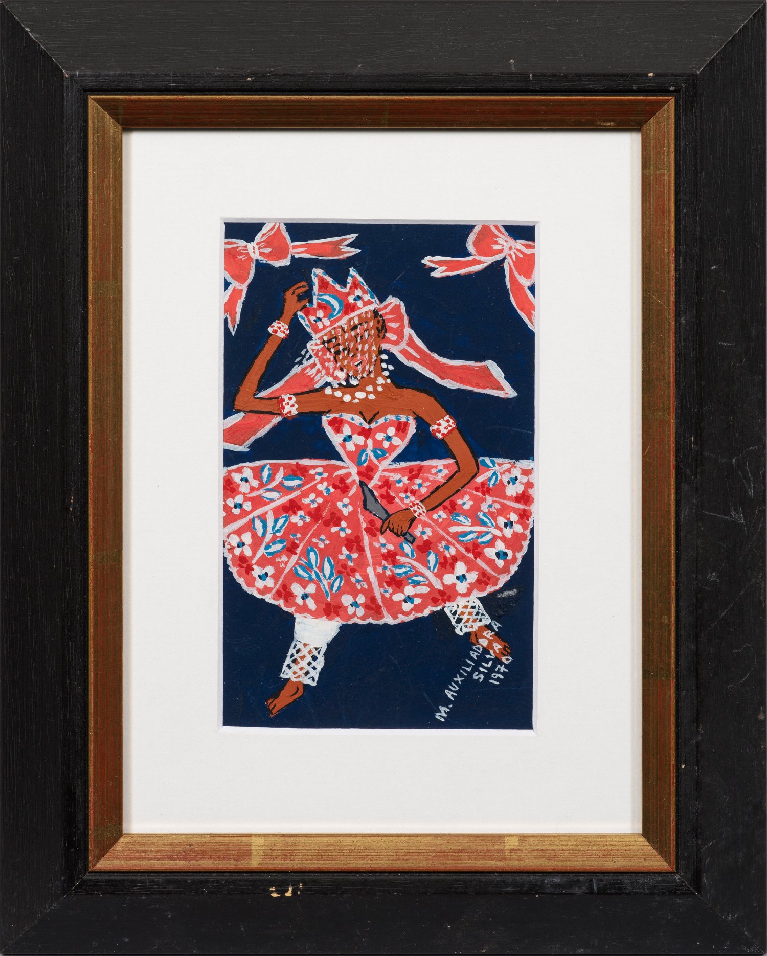 Auf nachtblauem Grund geschilderte Tänzerin in leuchtend rotem, floral gemustertem Kleid, Kopfschmuck und verschleiertem Gesicht. Maria Auxiliadora da Silva, die sich autodidaktisch bildete, verkörpert für viele bis heute die afro-brasilianische Kunst. In ihren Bildern mit oft dichten Texturen, feierte sie selbstbewusste Weiblichkeit und schilderte außer sich selbst im Wesentlichen folgende Themen: das alltägliche Gemeinschaftsleben und Volksveranstaltungen in São Paulo, insbesondere in den verarmten, vorwiegend schwarzen Vierteln wie Brasilândia und Casa Verde; afrobrasilianische Religionen und Riten (wie Candomblé), die Intimität und Zuneigung zwischen Frauen. Sie experimentierte mit diversen Materialien, fand zu einer einzigartigen Bildsprache und Anfang der 1970er Jahre auch zu einem hybriden Stil zwischen Malerei und Relief. Nach ersten Ausstellungen seit 1968 in Brasilien wurde die Künstlerin in den 1970er Jahren auch international bekannt. Mischtechnik/Papier. R. u. sign. und dat. 1970. Verso bez.; 16,5 cm x 10,2 cm. Rahmen.