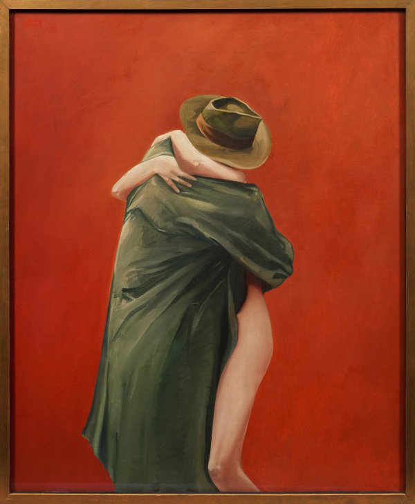 Seltenes Gemälde Brunis, der das Motiv seit ca. 1978 mehrfach in Grafiken und Bronzeplastiken darstellte. Der international bekannteste italienische Künstler studierte 1960-1965 an der Staatlichen Hochschule für Bildende Künste in Hamburg bei Georg Gresko und Paul Wunderlich. Seit 1967 wurde er mehrfach mit Preisen ausgezeichnet und in vielen Einzelausstellungen in Deutschland und weltweit präsentiert, u. a. in London, Mailand, Brüssel, Amsterdam, Tokio, New York und Melbourne. Den Schwerpunkt seines bildhauerischen und grafischen Oeuvres bilden harmonisch komponierte weibliche Akte und Liebespaare. Diese Liebespaardarstellungen erhalten durch den bekleideten männlichen Körper in Hut und Trenchcoat sowie den stehenden weiblichen Akt etwas Erzählerisches und Geheimnisvolles. Im Mittelpunkt seiner Kunst stehen zudem harmonisch komponierte Aktdarstellungen von schlanken Mädchen und jungen Frauen mit überlängten Proportionen, die sowohl Laszivität, Sinnlichkeit, Natürlichkeit und Erotik als auch die Eleganz und Schönheit des weiblichen Körpers zum Ausdruck bringen. Öl/Lwd.; L. o. sign.; 120 cm x 100 cm. Rahmen.