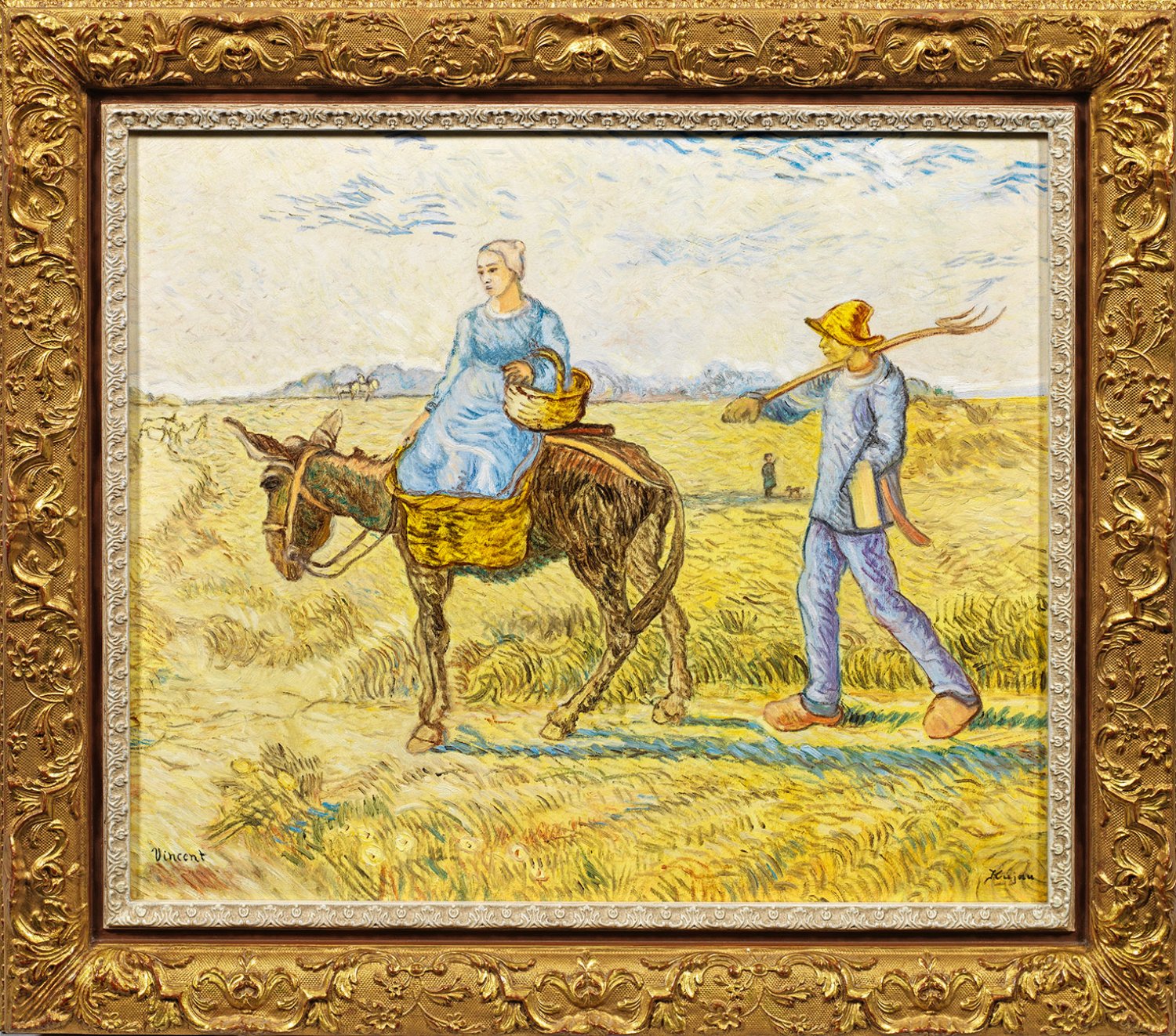 Im Stil Vincent van Goghs ausgeführte Darstellung eines jungen Bauernpaares, sie mit einem Korb auf dem Rücken eines Esels sitzend, er mit einer geschulterten Heugabel dahinter. Kujau wurde 1983 durch seine Fälschungen der sog. "Hitler-Tagebücher" für den "Stern" bekannt (die Geschichte wurde 1992 von Helmut Dietl satirisch unter dem Titel "Schtonk!" verfilmt); daneben schuf Kujau auch eine Vielzahl von ihm explizit als "Original Kujau-Fälschungen" deklarierter Bilder nach Malern unterschiedlichster Epochen und Stile. Öl/Lwd.; Unterhalb sign. bzw. bez. "Vincent" u. "Kujau". 50 cm x 60 cm. Rahmen.