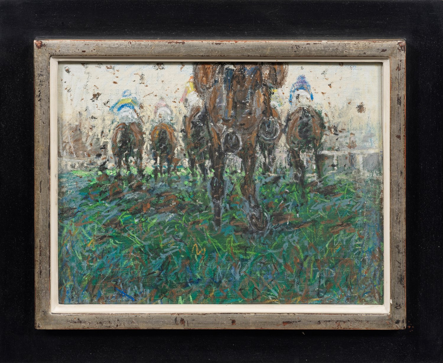 Impressionistisch aufgefasste Darstellung eines Rennens. Klaus Philipp, der als einer der besten zeitgenössischen Pferdemaler gilt, befasste sich seit seiner Jugend mit Pferden. Schon neben seiner Tätigkeit als Polizeireiter und Leiter der berittenen Polizei in Stuttgart widmete er sich der Pferdemalerei. 1980 schied er aus dem Polizeidienst aus und wandte sich ganz seiner Passion zu. Hierbei stellte er zahlreiche legendäre Pferde und ihre Reiter dar, teilw. im Auftrag ihrer vermögenden, prominenten, internationalen Besitzer und stellte vielfach aus. Mischtechnik (Wachskreide u. Ölpastell)/Lwd.; Verso auf dem Rückenkarton sign., dat. 1981 u. betitelt, Materialangaben. 21 cm x 28,5 cm. Rahmen.