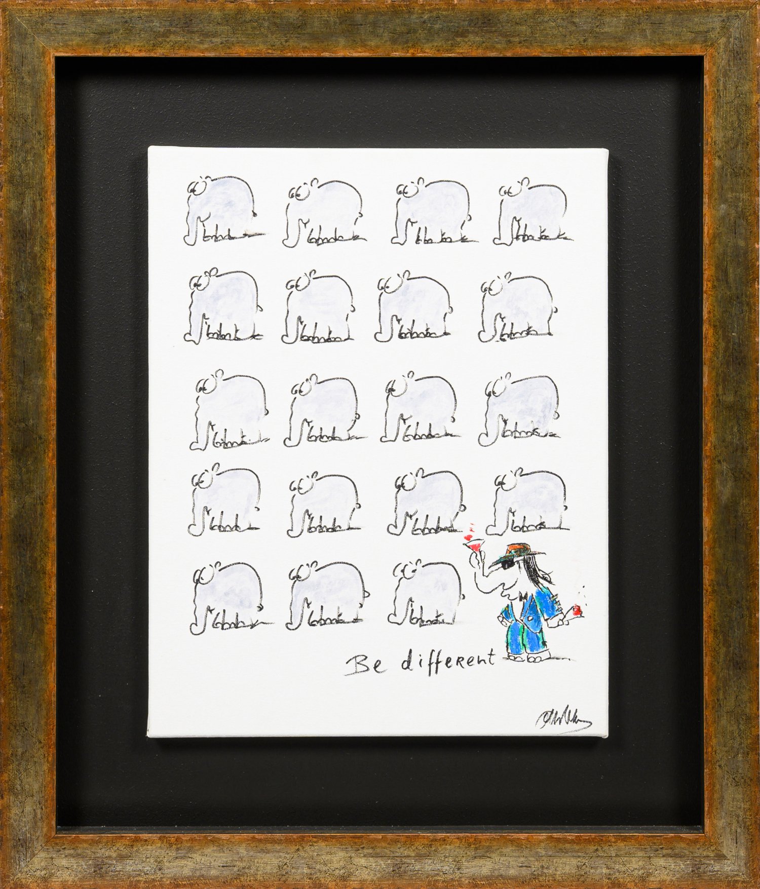 Humoristische Arbeit des bekannten ostfriesischen Künstlers Otto Waalkes, einen Ottifanten darstellend, der den breitkrempigen Hut, die dunkle Sonnenbrille und den locker sitzenden Anzug als signifikante Erkennungsmerkmale des legendären Musikers und Künstlers Udo Lindenberg trägt und damit farbenfroh und auffällig aus der homogenen Masse der anderen Ottifanten deutlich heraussticht. Der Titel ist hier Programm: "Be different"! Der Ottifant als Comicfigur ist fast genauso populär wie sein Schöpfer, dem in den 1980er Jahren der Durchbruch als Komiker gelang und einen prominenten Bekanntheitsgrad einbrachte. Was jedoch beinahe ein Geheimnis zu sein scheint, ist, dass Waalkes Kunstpädagogik an der Hochschule für bildende Künste in Hamburg studiert hat - ein Studienplatz für freie Malerei blieb ihm leider verwehrt. Während seiner Studienzeit wohnte er in der legendären Künstler-WG "Villa Kunterbunt" in Hamburg-Winterhude, zusammen mit u. a. Udo Lindenberg, Marius Müller Westernhagen, Steffi Stephan und Günter Fink. Schwarzer Filzstift und Acryl/Lwd.; R. u. betitelt und sign.; 50,5 cm x 40,5 cm. Rahmen.